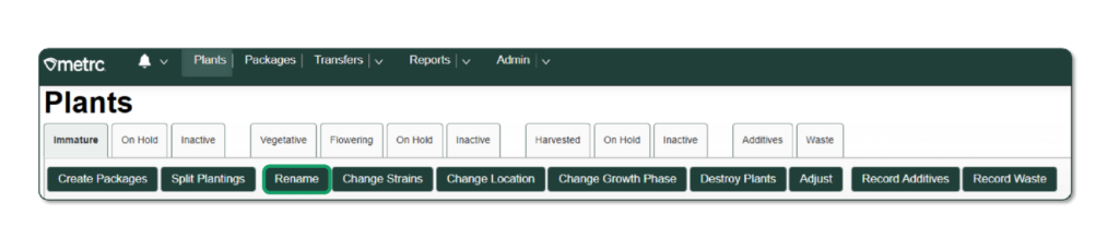 To rename a mislabeled immature plant batch or harvest batch, select the “Rename” option and update it to the correct name you would prefer to have displayed.