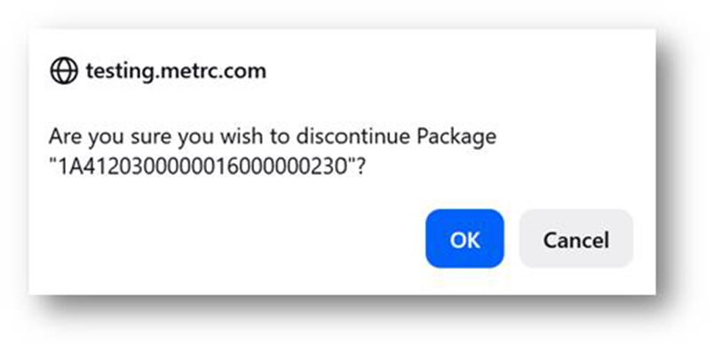 Important tip! A package can only be discontinued so long as it hasn’t had another action (e.g. adjusted, submitted for testing, used in another package, or transferred) reported to it. If the package ID is discontinued, it will no longer be available for further use and will be stored within the “Inactive” tab for reference purposes only.