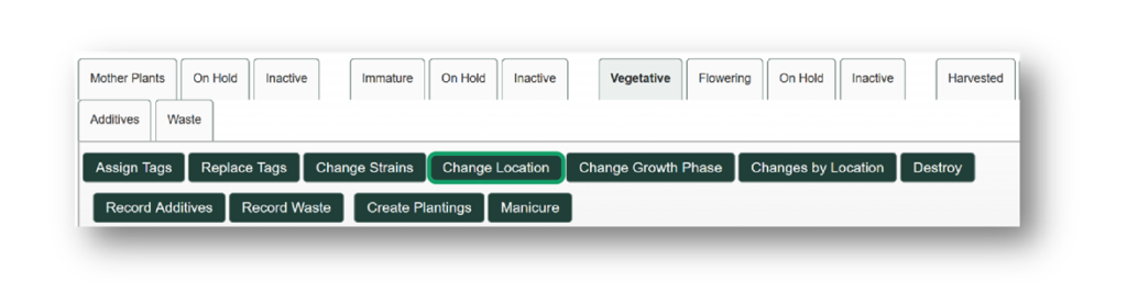 Select the “Change Location” option within the Immature, Vegetative, Flowering, or Harvest sections, or the “Change Locations” option within the Active Packages section and update the location for the Plant(s), Harvest(s), or Package(s) selected.