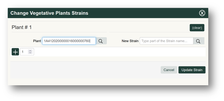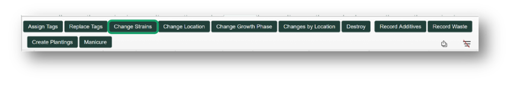 If mislabeled, a strain name can be updated before harvesting during any previous growth phase. To update, select the “Change Strains” button, which is found within the Immature, Vegetative, or Flowering tab, and enter the Plant Batch Type and change the strain name to the correct one that you would like to be displayed.