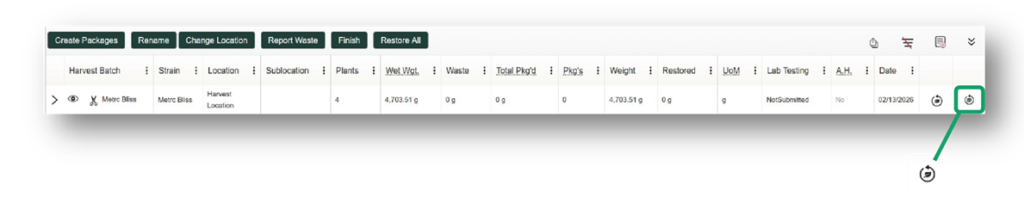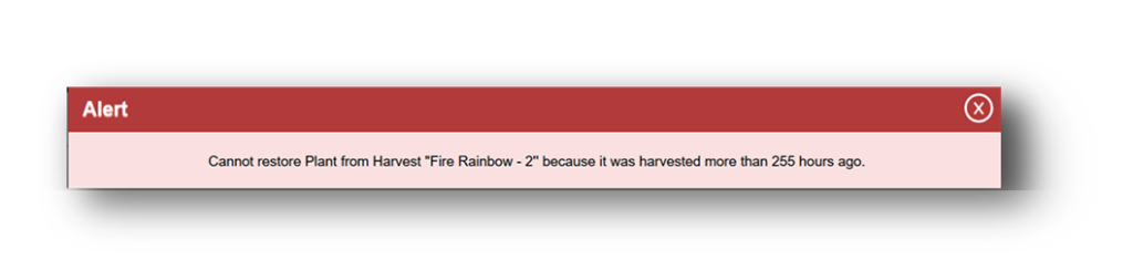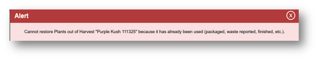 Depending on what previous actions have been taken, the “Discontinue” button, or “x” icon, in the Harvested Tab under the Plants section may be used to indicate which plant or plants you would like to “Restore” back to their previous state. This can only be used if it is within the time frame allowed by your state regulatory agency.