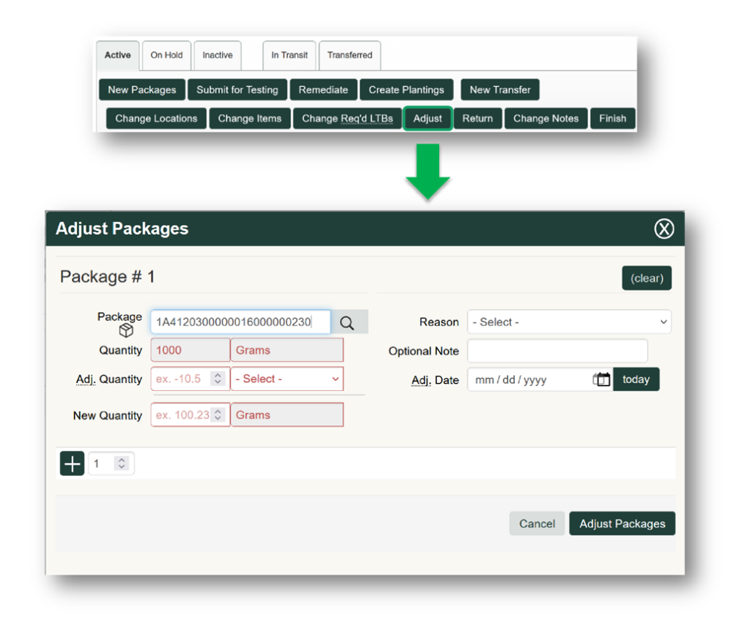 You can select the “Adjust” button to indicate the proper quantity that the package ID represents. Adjustments can be either a positive or negative adjustment to a package ID depending on the discrepancy.